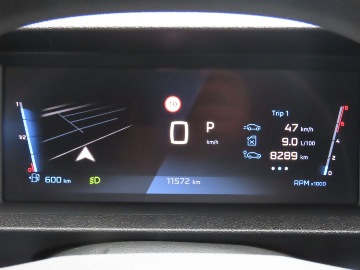 Shows real-time information about your journey including fuel consumption, distance traveled, average speed, and estimated range remaining on the dashboard display.